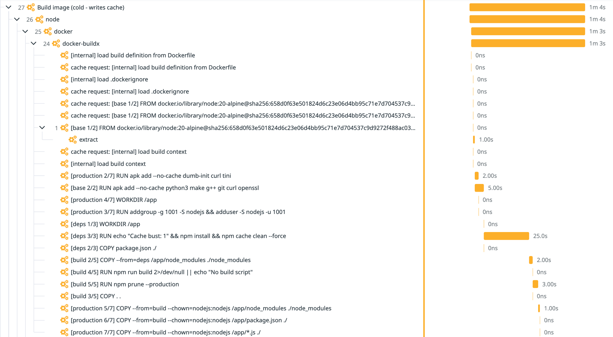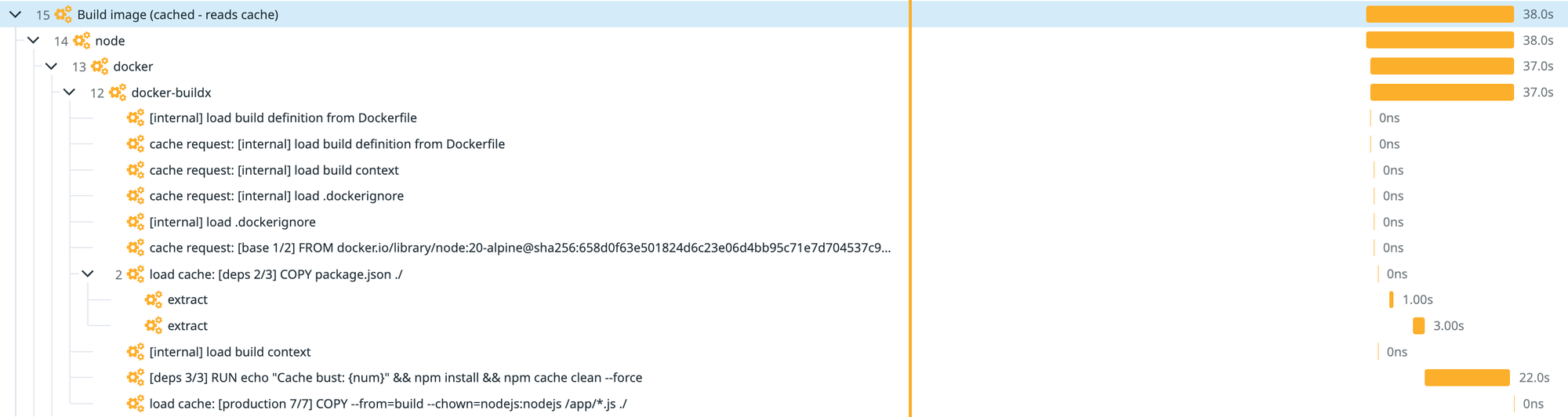 [deps 3/3] RUN npm installtaking 25 seconds, you seeload cache: [deps 2/3] COPY package.json ./with twoextractchild spans - The cache is being pulled from GitHub Actions cache storage and extracted, taking about 3-4 seconds total instead of 25